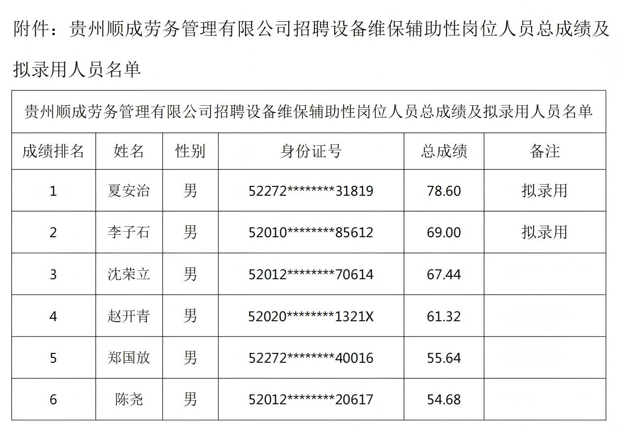 贵州顺成劳务管理有限公司招聘设备维保辅助性岗位人员总成绩及拟录用人员公示